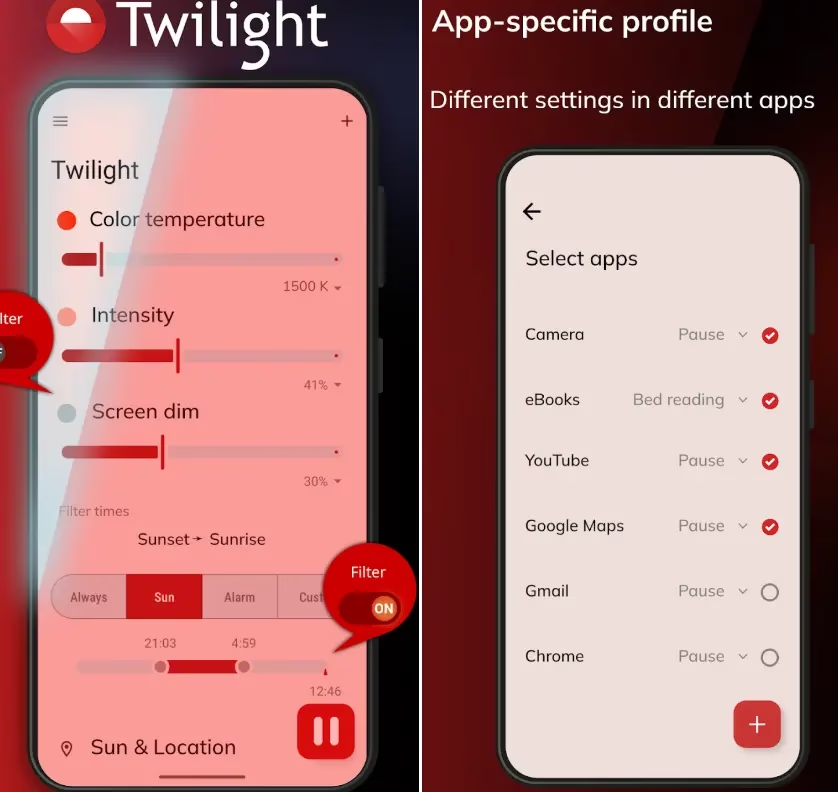 Twilight app blue light filter comparison – Normal screen vs Twilight warm filter for healthy sleep