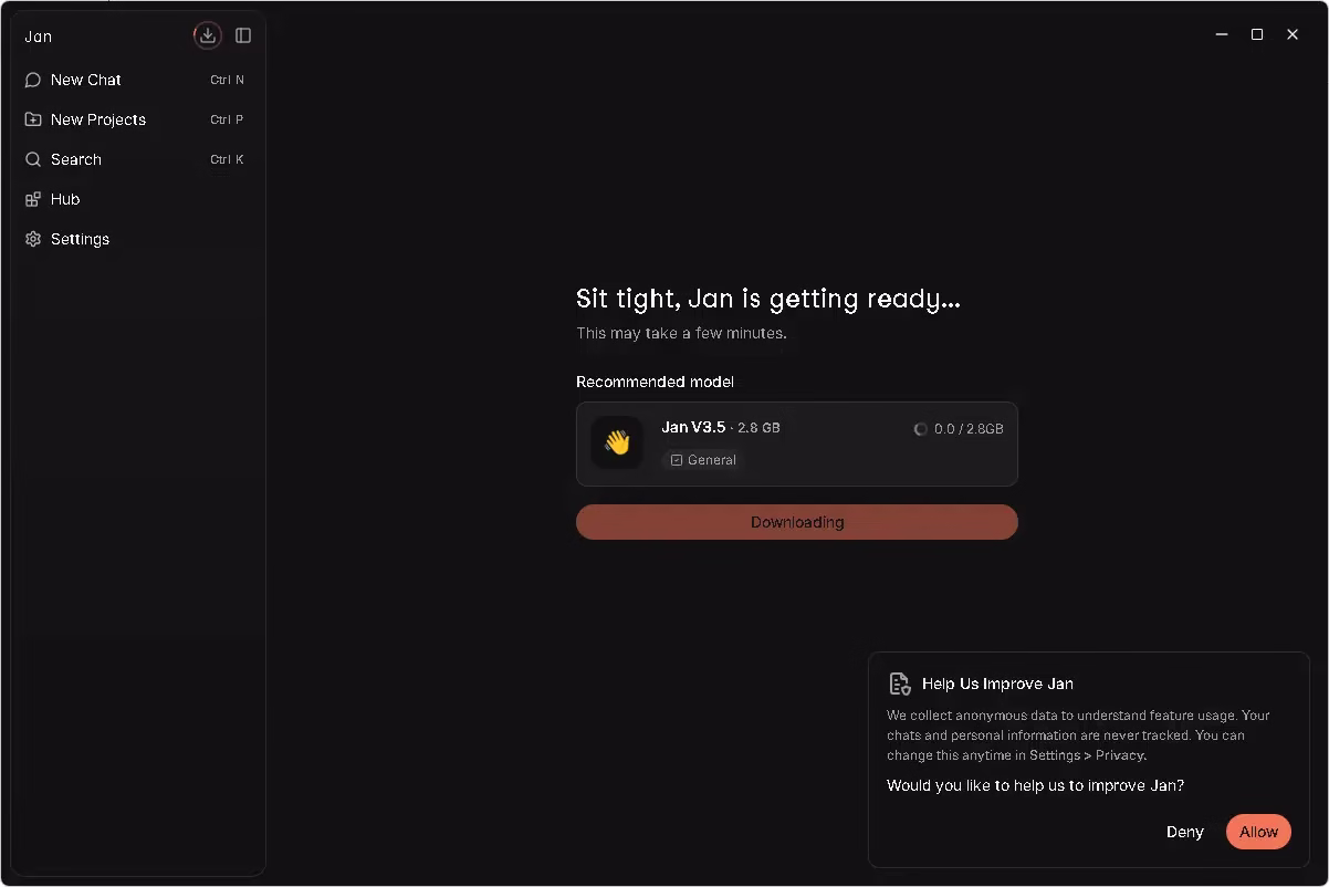 - On first launch, Jan AI will recommend downloading a starter model. The recommended Jan V3.5 (2.8 GB) is a great starting point for general-purpose tasks.