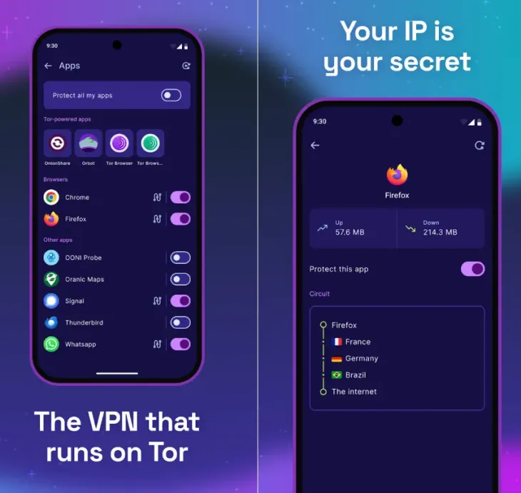 Tor Browser safeguards your online activity. No matter what program you’re using on your phone—messaging, social media, or news reading—Tor VPN will shield your complete internet connection.
