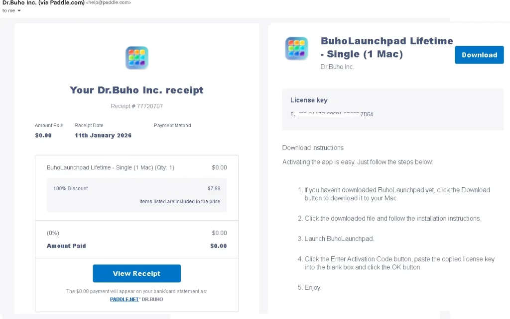 Check your email inbox for an email from Dr.Buho Inc. (via Paddle.com), this email offers a license key.