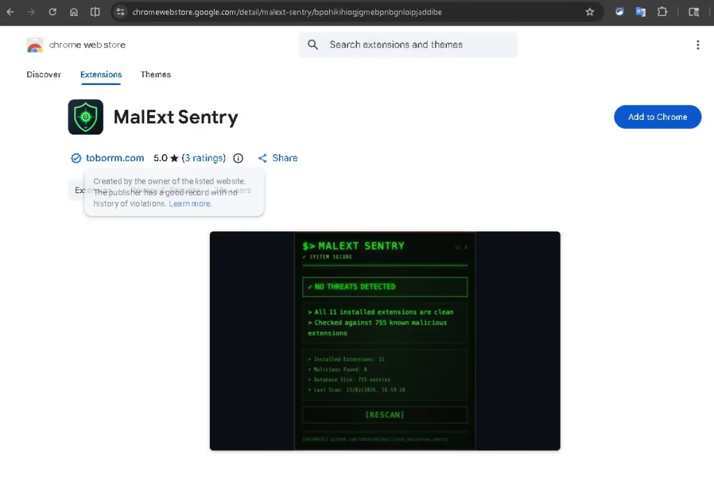 As you can see from the Chrome Web Store listing above, MalExt Sentry currently holds a perfect 5.0-star rating and is published by toborrm.com — a verified publisher with no history of violations. The store listing itself shows a live scan result: 11 installed extensions scanned, 0 malicious found, checked against a database of 755 known threats.