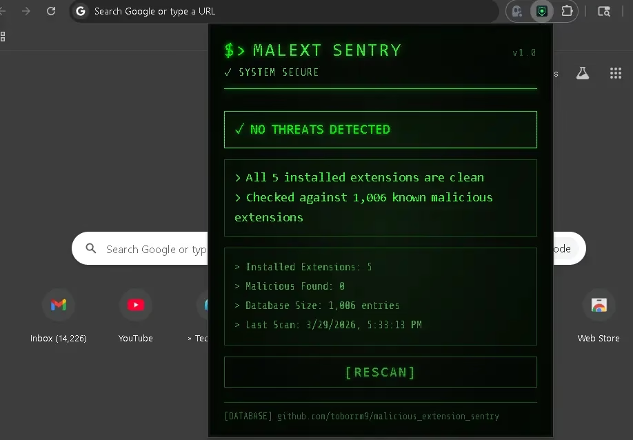 The screenshot above shows MalExt Sentry’s clean, terminal-style interface displaying “NO THREATS DETECTED” after scanning 5 installed extensions against a database of 1,006 known malicious extensions. The last scan timestamp, database size, and a one-click [RESCAN] button are all immediately visible — no complex menus, no confusing dashboards.