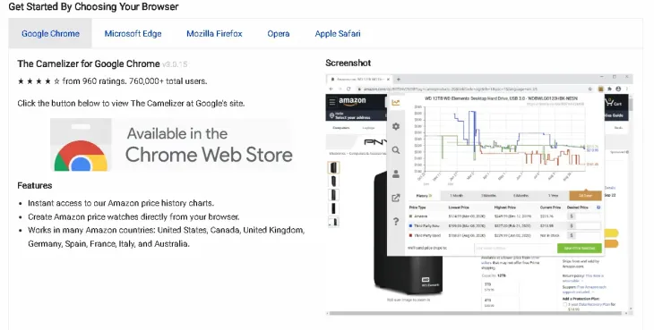 Run by CamelCamel.com. This is yet another top-notch tool for monitoring Amazon pricing. You may get this extension for Safari, Opera, Microsoft Edge, Chrome, and Firefox.