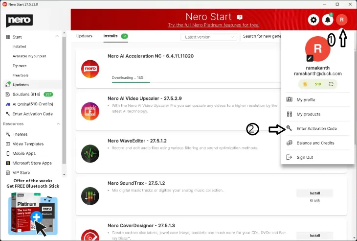 Nero will send you an email containing the download link for the Nero Start installer, as well as a license or activation code.