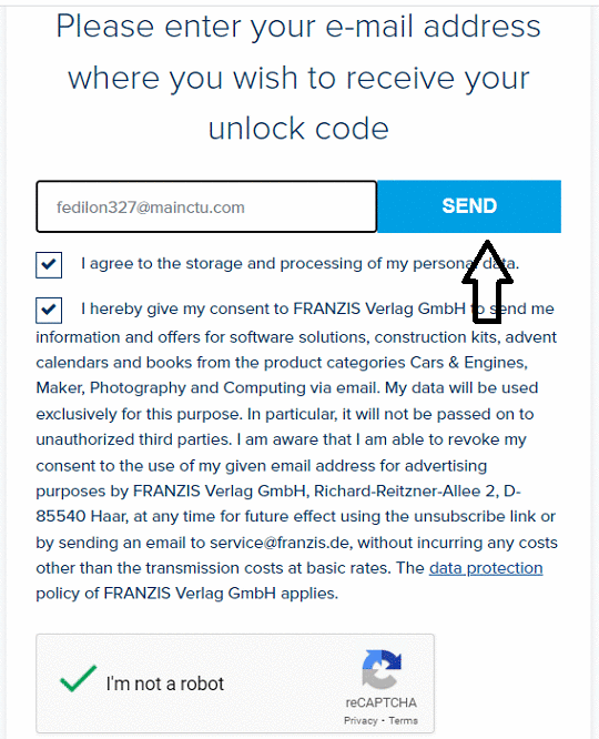 Enter your email address, check the box indicating that you agree to the terms, complete the captcha, and click the “Send” button.