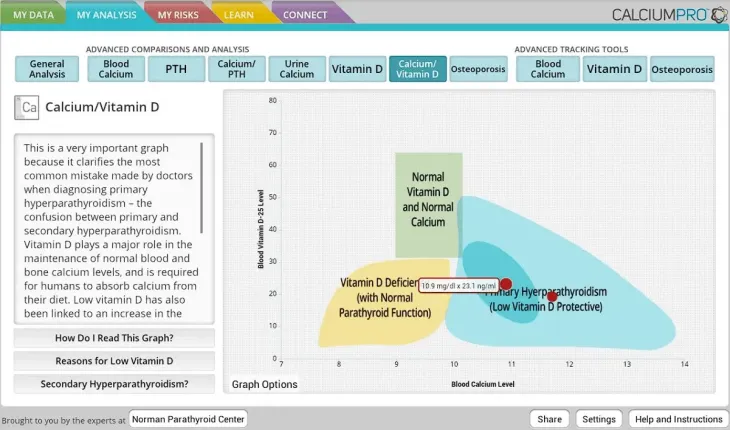 Just enter your test results for calcium, parathyroid hormone, and vitamin D. Calcium Pro will analyze and graph your tests for easy understanding. It also shows your parathyroid gland status and chance of hyperparathyroidism.