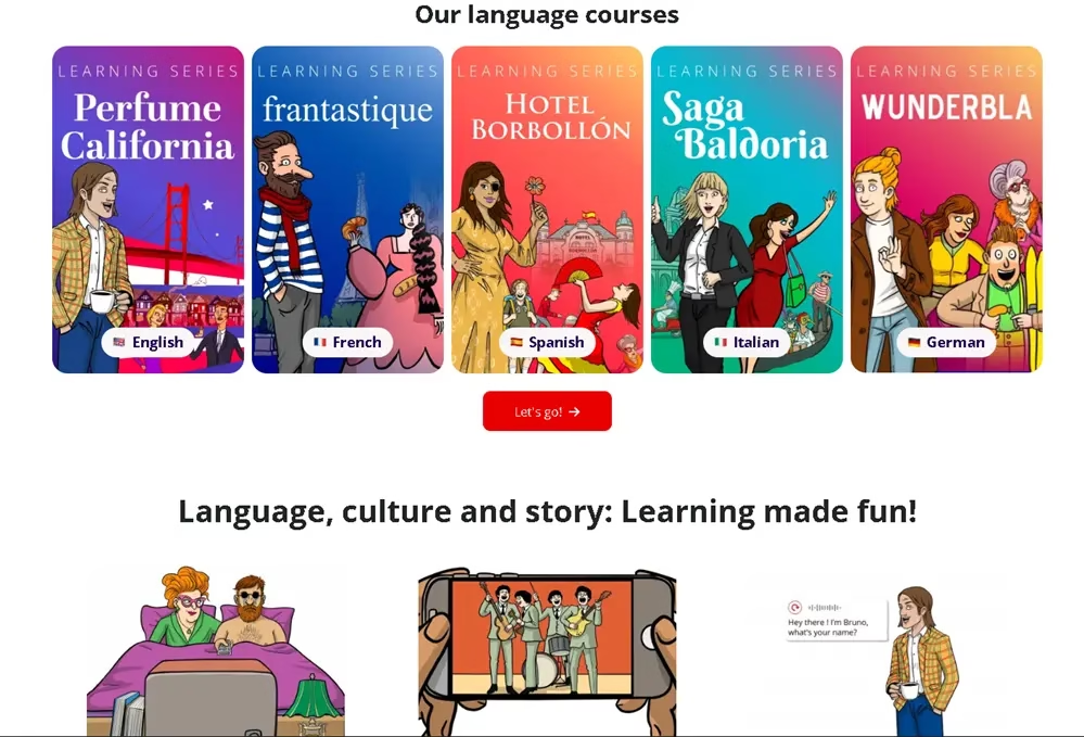 In addition to vocabulary and grammar, you will also learn about the culture. All language courses offer a mix of cultural references, distinct personalities, accents and dialects, scenes from private and professional life, and much more. There is a new lesson every day, simply by email or app.