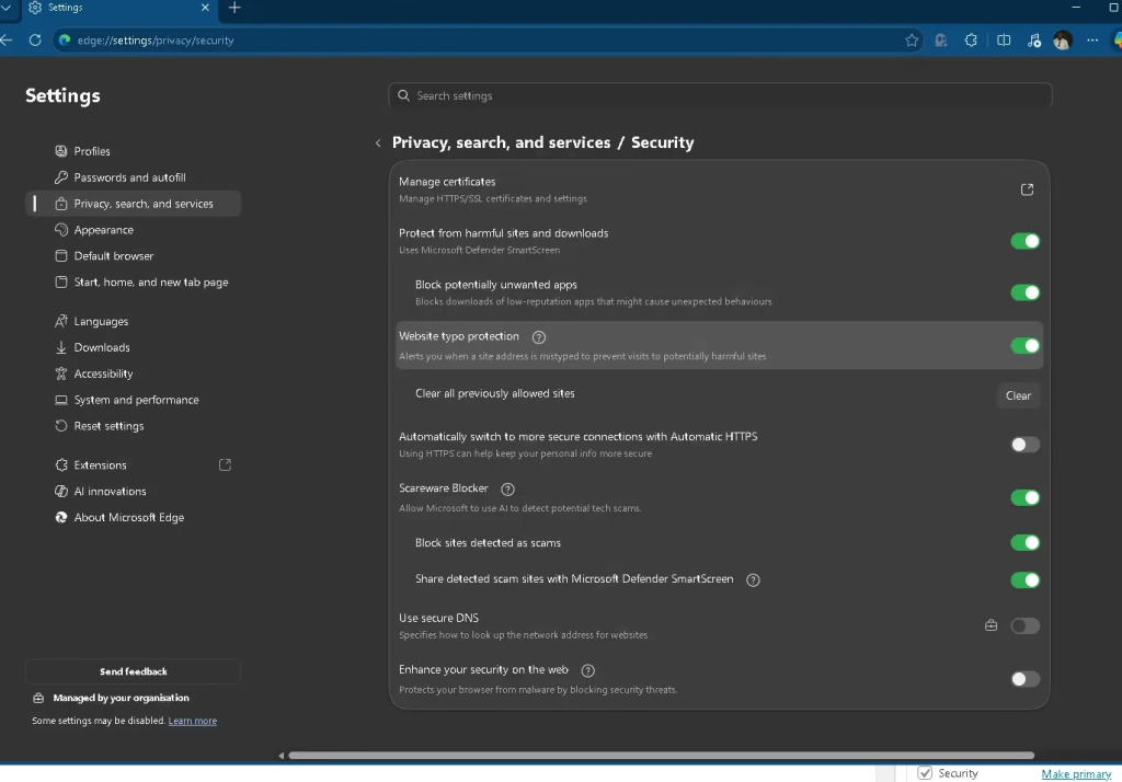 For Microsoft Edge (built-in): Go to Edge Settings → Privacy, Search, and Services