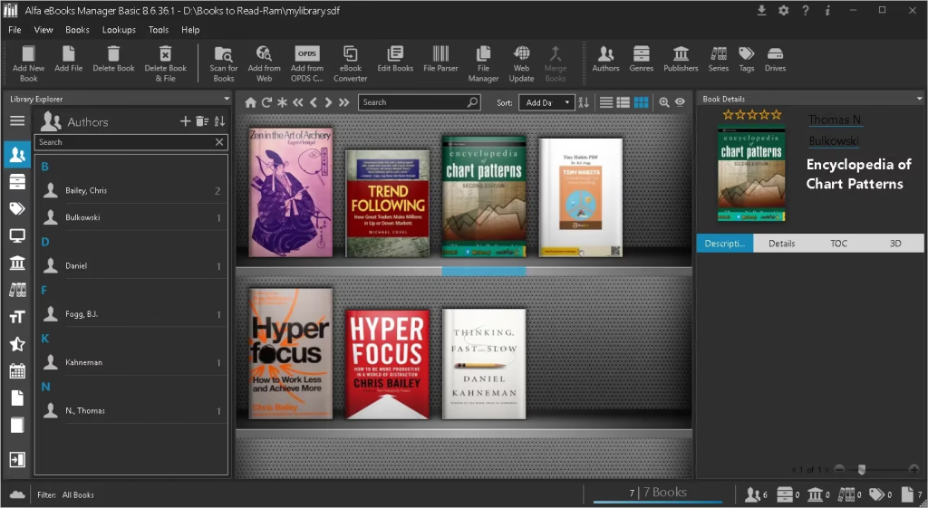 One of the most distinctive features of Alfa eBooks Manager is its 3D book view. You can browse your collection in a realistic virtual bookshelf environment with customizable shelf templates, making the experience of managing your library both functional and visually enjoyable.